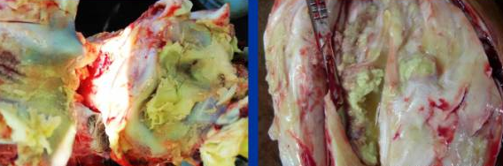 支原體關(guān)節(jié)炎:關(guān)節(jié)腔內(nèi)黃色纖維素性滲出物