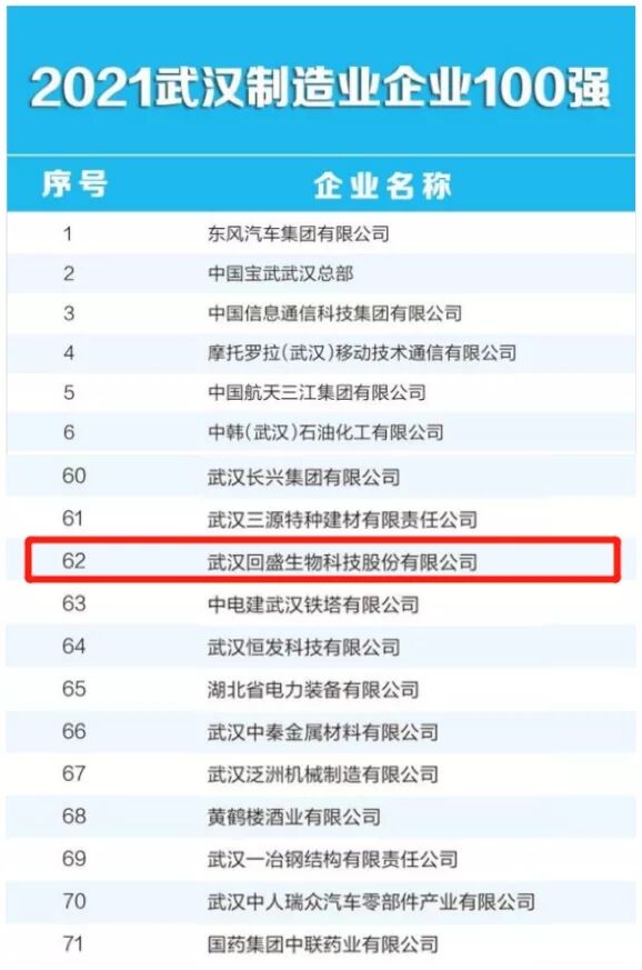 熱烈慶祝回盛生物入選武漢制造業(yè)企業(yè)100強(qiáng)