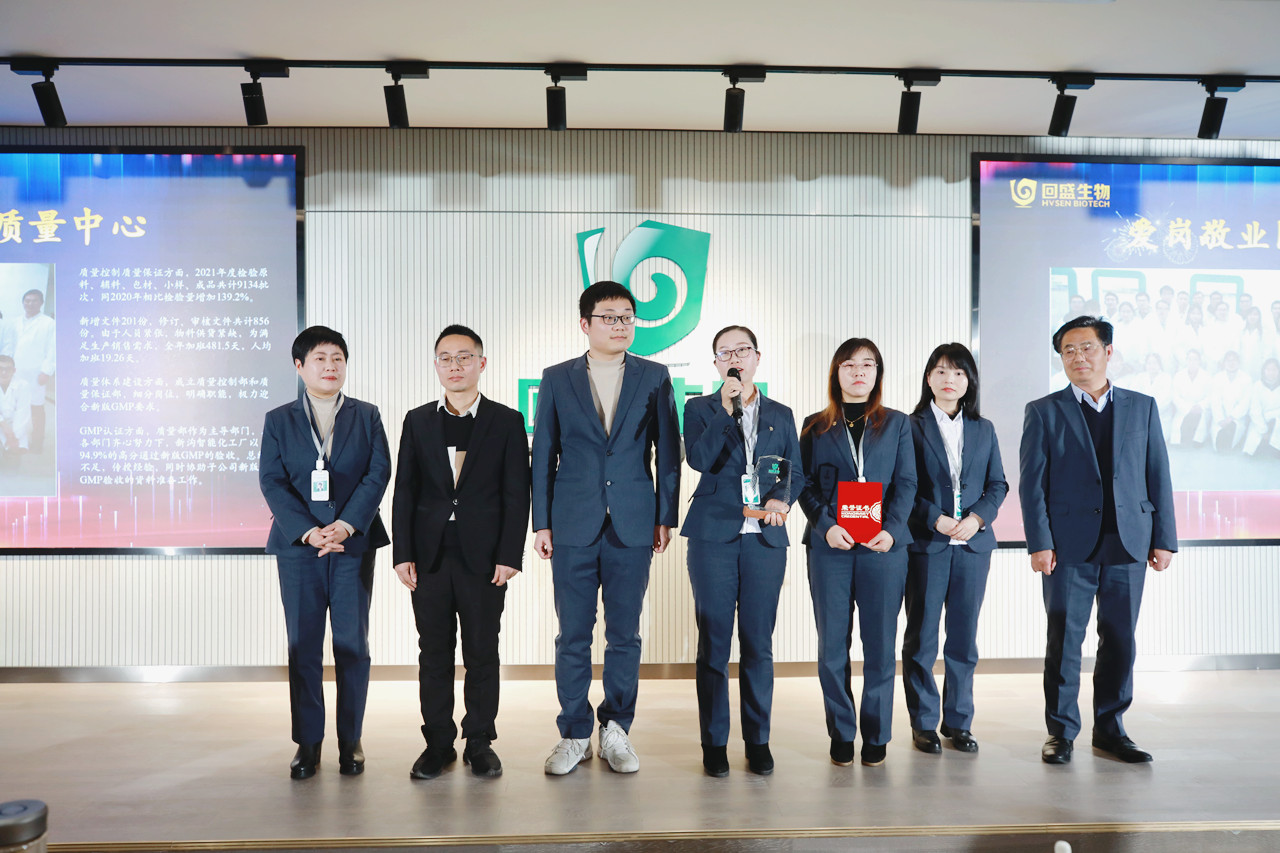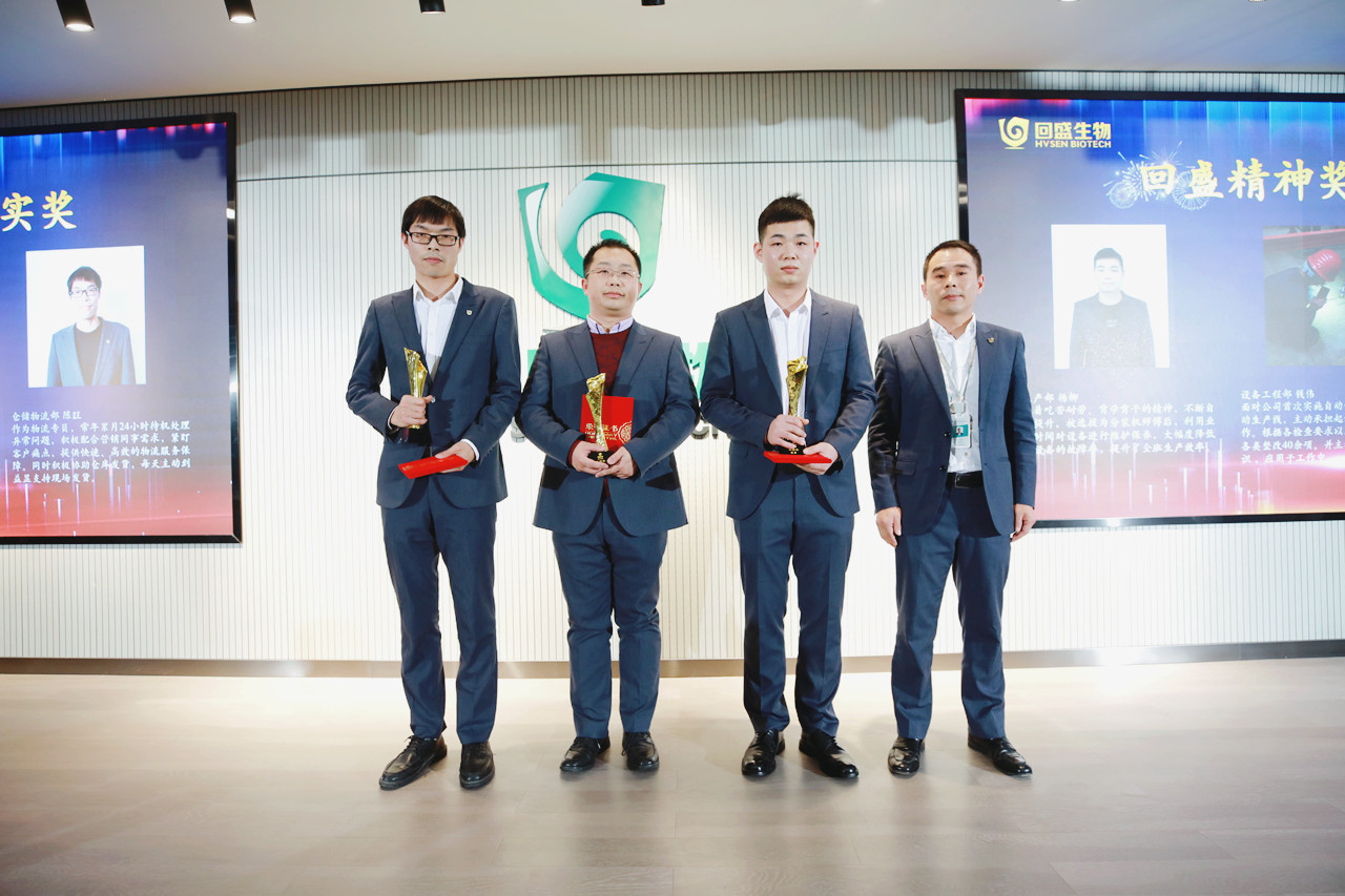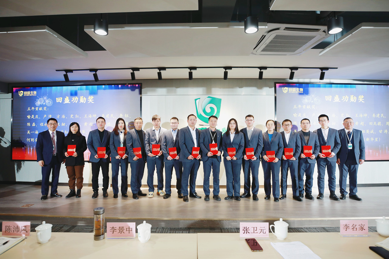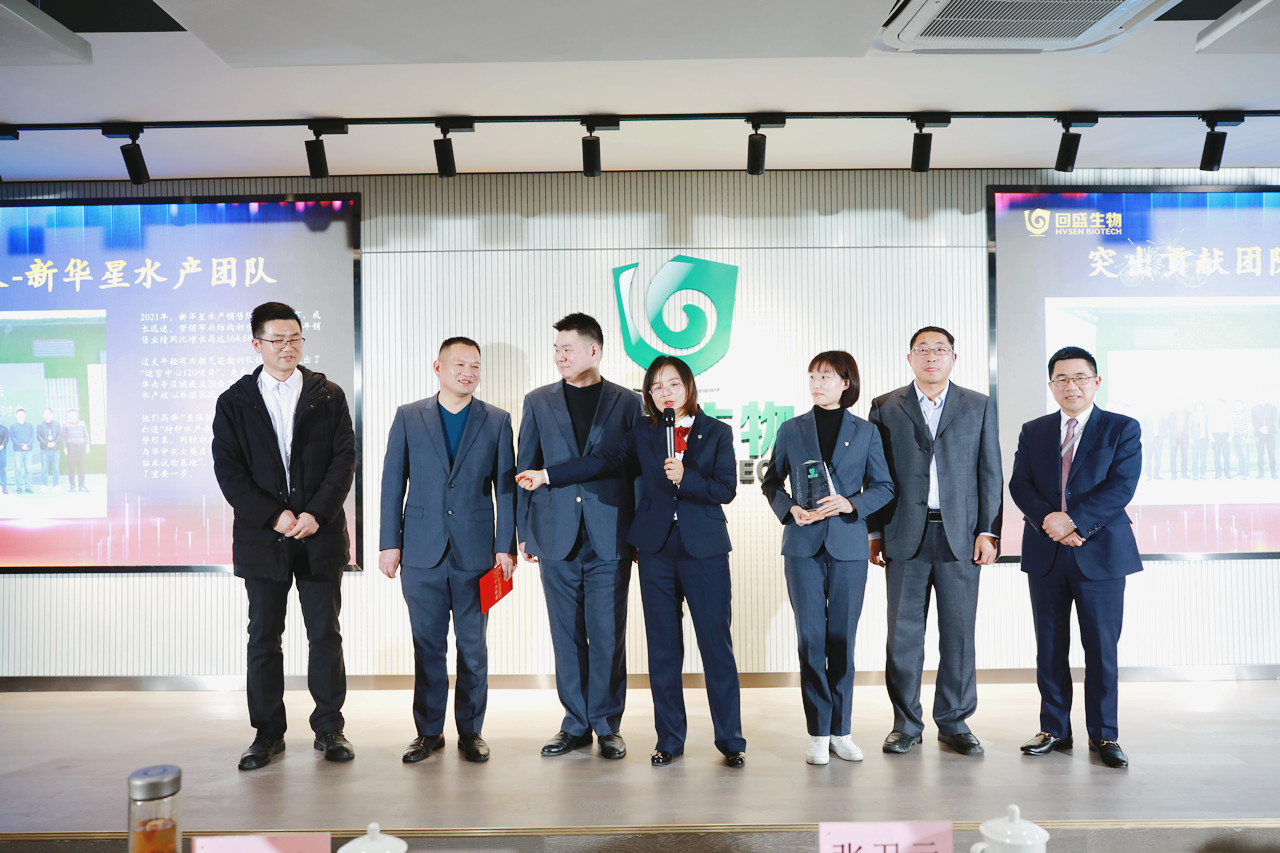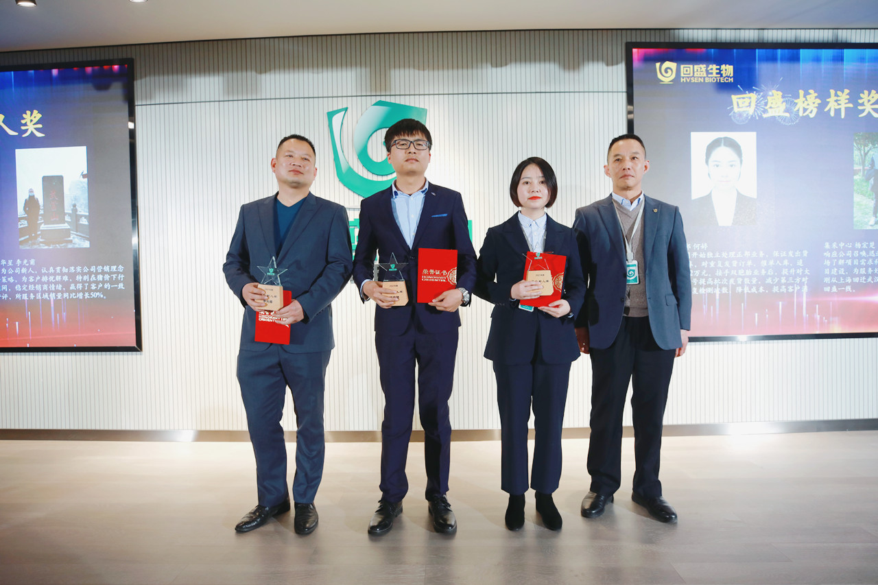 在觀看《開啟更好2022》新年祝福視頻后,大會對在2021年中取得優(yōu)異成績和工作中表現(xiàn)突出的個人和團體進行了表彰。張衛(wèi)元、李名家、李景中、劉潔等領(lǐng)導依次為銷售貢獻獎、回盛精神獎、回盛榜樣獎、回盛功勛獎榮譽稱號獲得者一一頒授證書、獎杯。