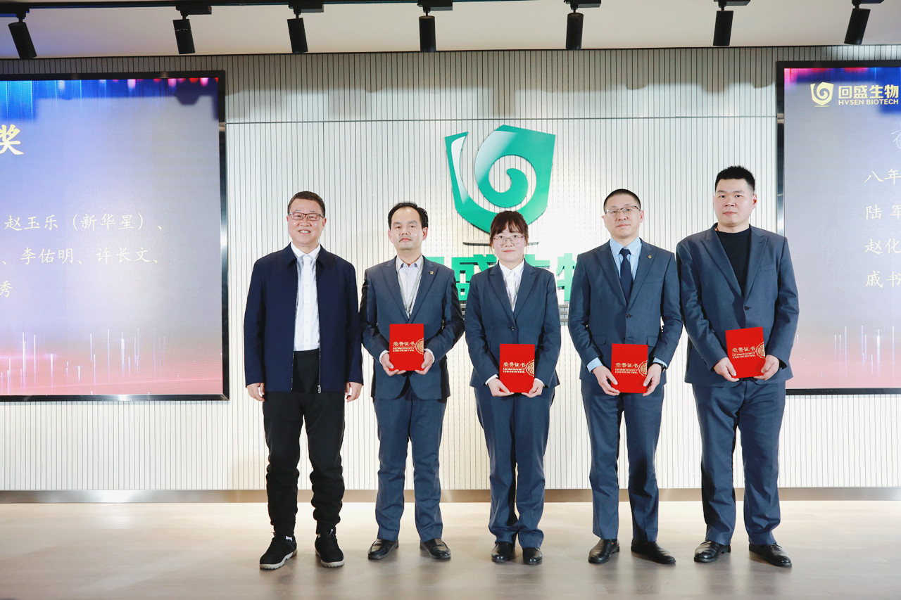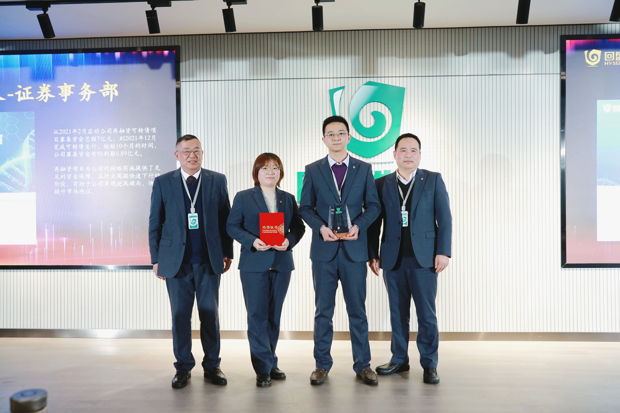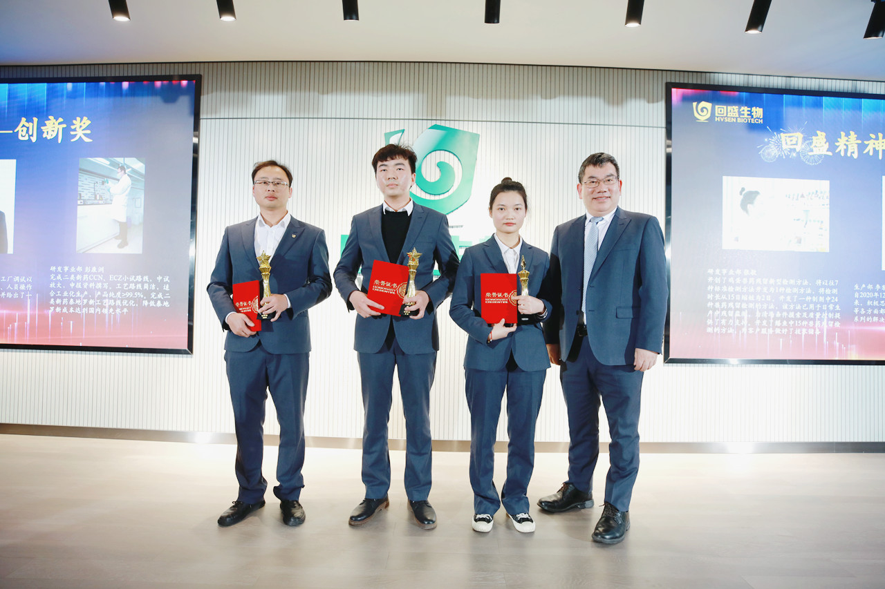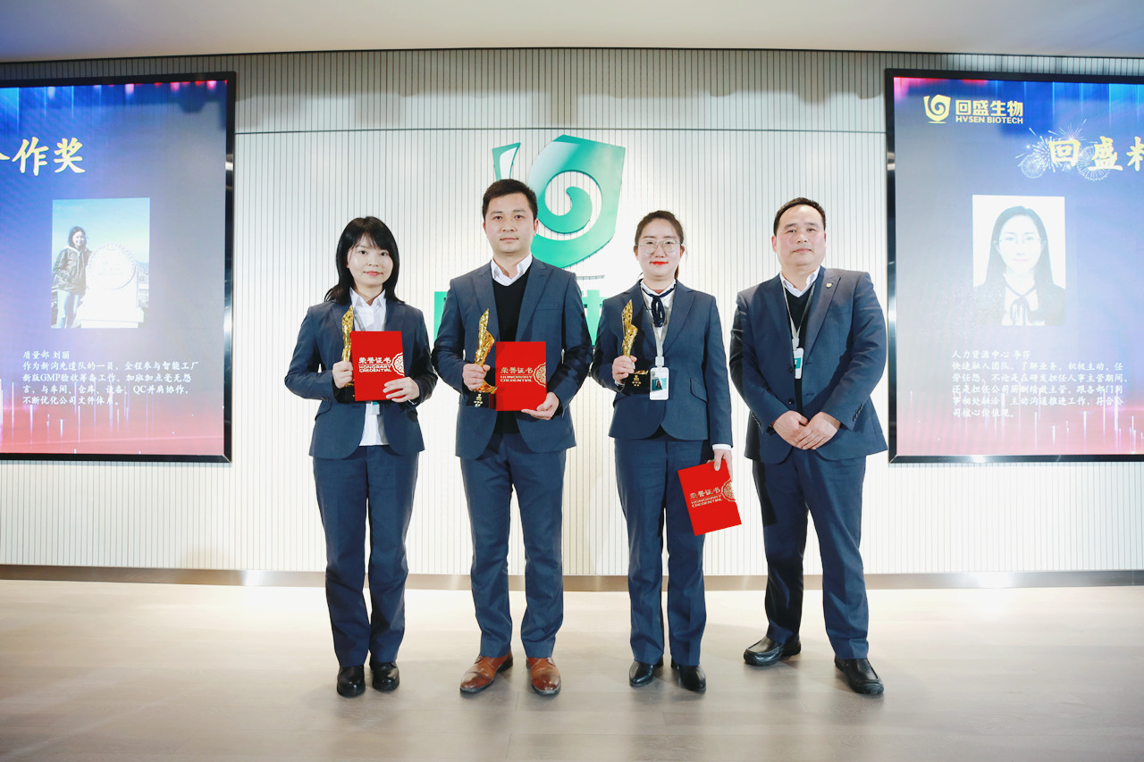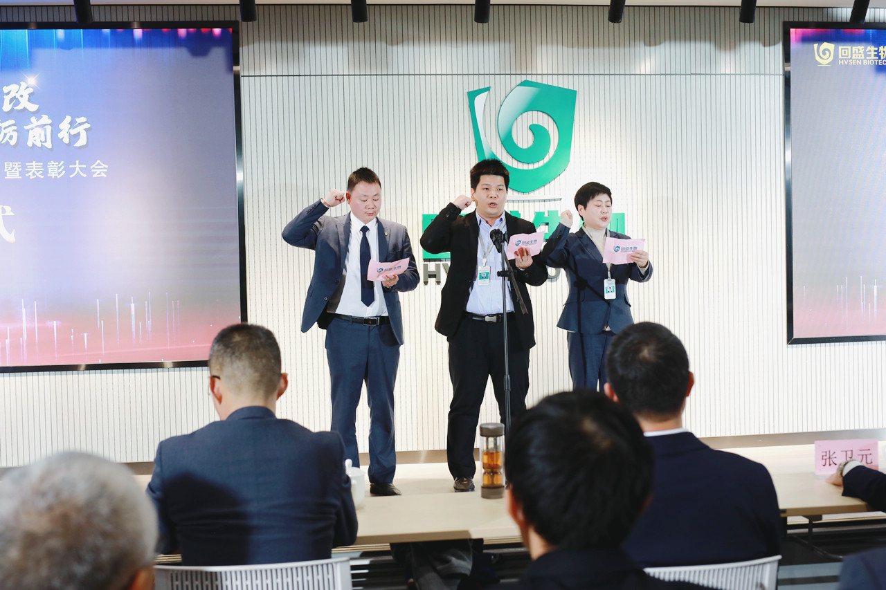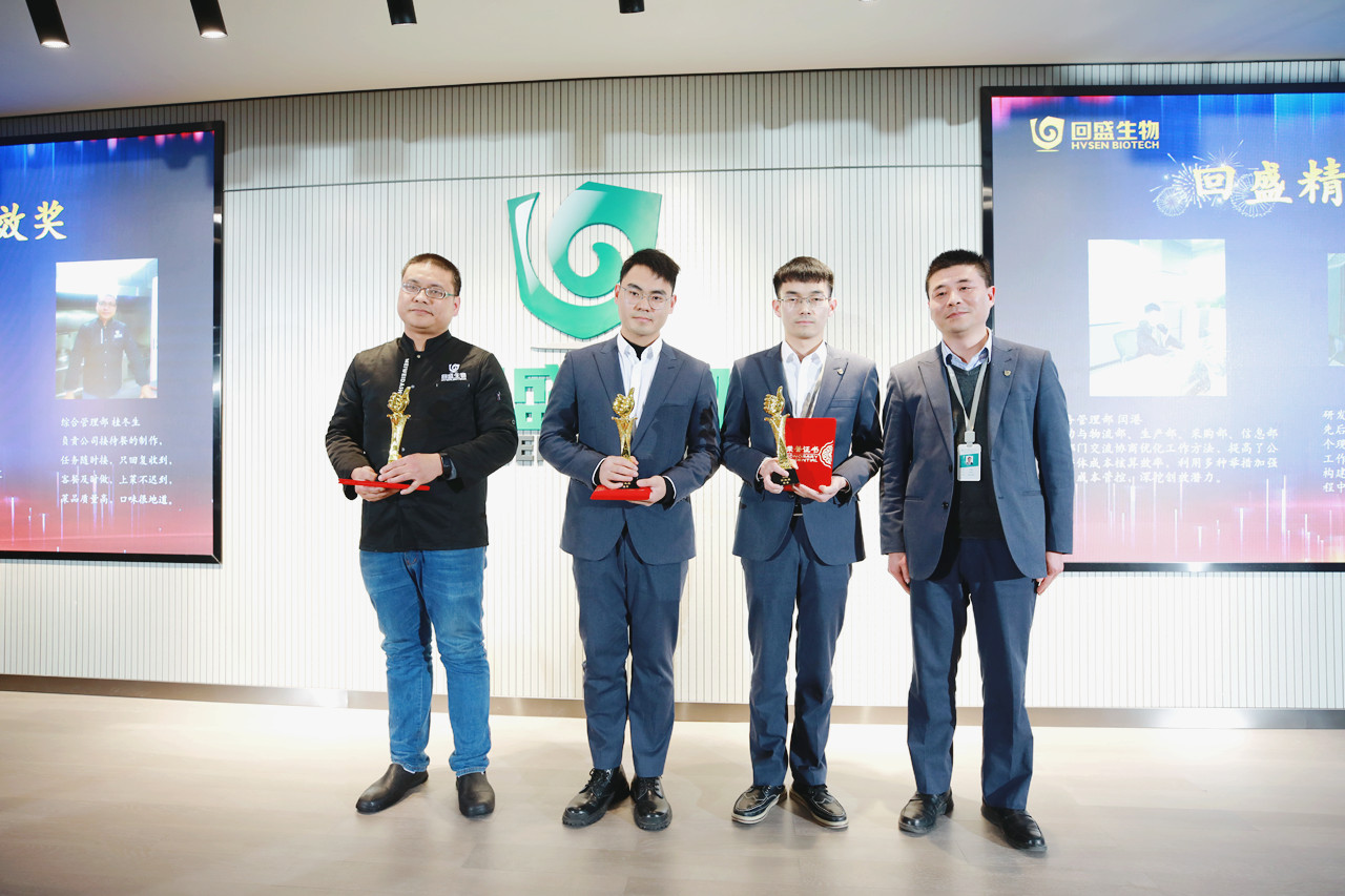 在觀看《開啟更好2022》新年祝福視頻后,大會對在2021年中取得優(yōu)異成績和工作中表現(xiàn)突出的個人和團體進行了表彰。張衛(wèi)元、李名家、李景中、劉潔等領(lǐng)導依次為銷售貢獻獎、回盛精神獎、回盛榜樣獎、回盛功勛獎榮譽稱號獲得者一一頒授證書、獎杯。