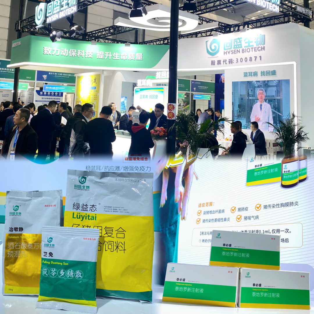 在T136展臺(tái),回盛生物旗下包括防治豬藍(lán)耳病的“穩(wěn)藍(lán)增免”方案、全新一代治嗽靜(20%酒石酸泰萬菌素預(yù)混劑)、泰必盛(泰地羅新注射液)等多款產(chǎn)品紛紛亮相;客戶經(jīng)理、技術(shù)老師、研發(fā)同事與來自全國各地的合作伙伴交流、分享公司的最新產(chǎn)品和研究成果。