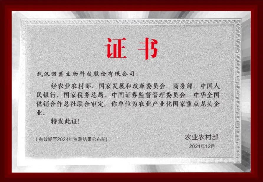 回盛生物獲“農(nóng)業(yè)產(chǎn)業(yè)化國家重點(diǎn)龍頭企業(yè)”稱號