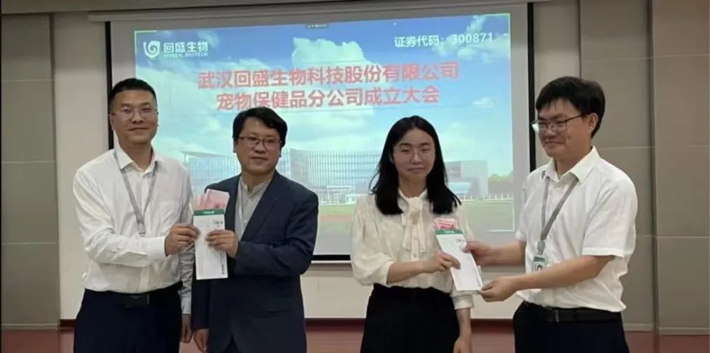 2022年2月25日,湖北省動保技術(shù)開發(fā)有限公司成立;2022年4月26日,武漢回盛生物科技股份有限公司寵物保健品分公司正式注冊成立,分公司在公司張柏路研發(fā)基地舉辦了成立大會。