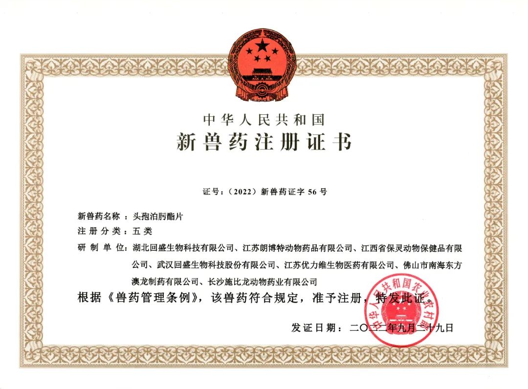 2022年9月30日,根據(jù)《獸藥管理?xiàng)l例》和《獸藥注冊辦法》規(guī)定,經(jīng)中華人民共和國農(nóng)業(yè)農(nóng)村部(以下簡稱“農(nóng)業(yè)農(nóng)村部”)審查,批準(zhǔn)武漢回盛生物科技股份有限公司(以下簡稱“公司”)及全資子公司湖北回盛生物科技有限公司、長沙施比龍動物藥業(yè)有限公司等單位申報(bào)的“頭孢泊肟酯片”為新獸藥。